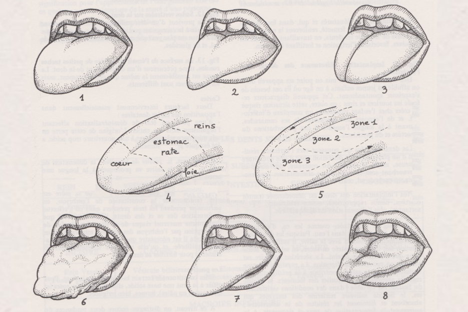 Fig. 5 Langue et enduit, on doit toujours considérer la zone sur laquelle il apparait. Il progresse du fond vers l’extrémité, il vient de l’énergie de l’estomac et c’est un baromètre. Après avoir atteint l’extrémité de la langue, lorsque l’organisme rétablit son équilibre, l’enduit régresse vers le fond.