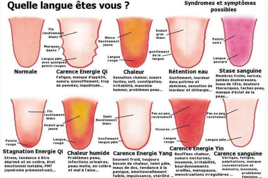 Les marques de dents sur les bords de la langue, si elles ne sont pas liée à l’occlusion de la bouche témoignent d’un vide du Yang de la Rate, si l’aspect est gonflé c’est un débordement du Yin. Nourriture mal digérée dans le gros intestin.